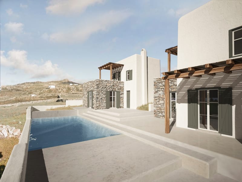 The project involves the construction of a new complex with a total capacity of 6 apartments and 15 beds, located within the traditional settlement of Ano Mera — an area characterized by a strong local identity and strict urban planning and morphological regulations. The complex is developed in two independent main volumes, positioned amphitheatrically at the center of the plot, aiming to provide unobstructed views and harmonious integration into the landscape.