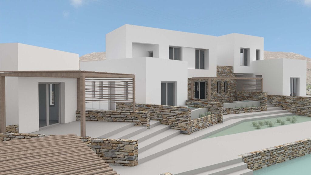 Next, a key design starting point was an in-depth study and understanding of the traditional and vernacular architecture of Syros, with an interpretation of its forms and compositions into simple and modern lines.