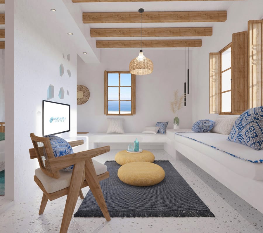 The design concept focuses on creating a holistic hospitality experience, inspired by the name of the hotel itself. The feeling of the sea’s blue hues, crystalline water, and natural light is carried throughout the interiors, through carefully selected materials, lighting, and color tones that evoke an atmospheric and welcoming environment.