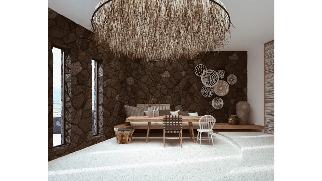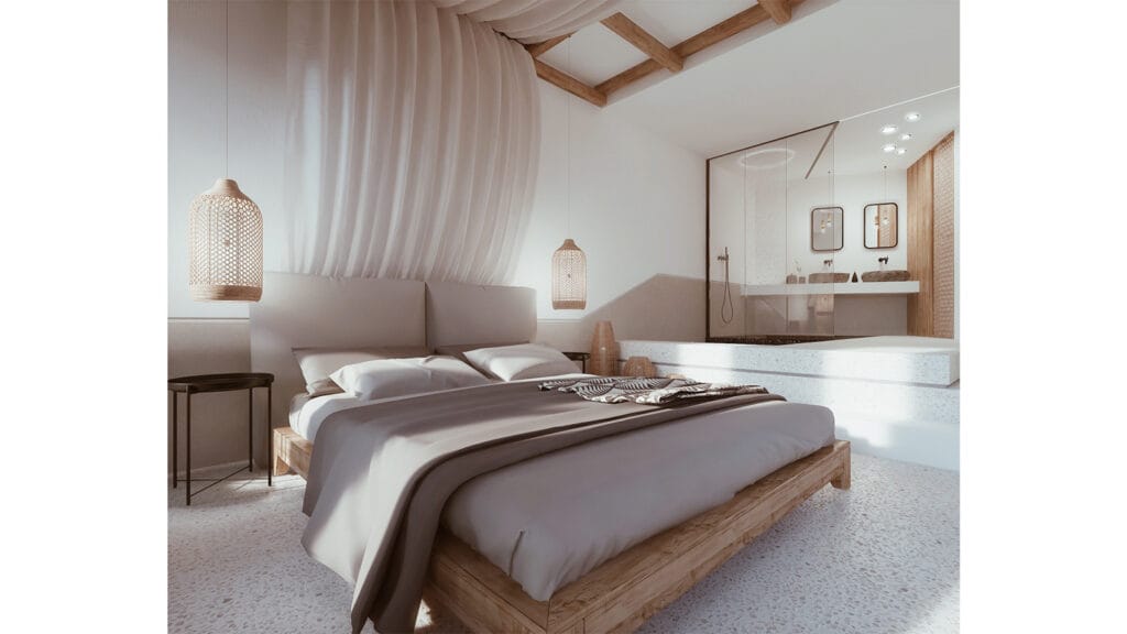 Ακολουθώντας την παραδοσιακή κυκλαδίτικη αρχιτεκτονική επιλέχθηκαν λευκοί όγκοι που πλαισιώνονται από το ξερό φυσικό περιβάλλον της Σαντορίνης, ενώ έντονες γραμμικές πέτρινες διαμορφώσεις διεύρυναν την ποικιλία στις υλικότητες, με τις πεζούλες και την ενσωμάτωση ξύλινων και μαύρων στοιχείων, να συνθέτουν με αισθητική ισορροπία το σύνολο της πρότασης και να δημιουργούν ευχάριστες οπτικές αντιθέσεις.