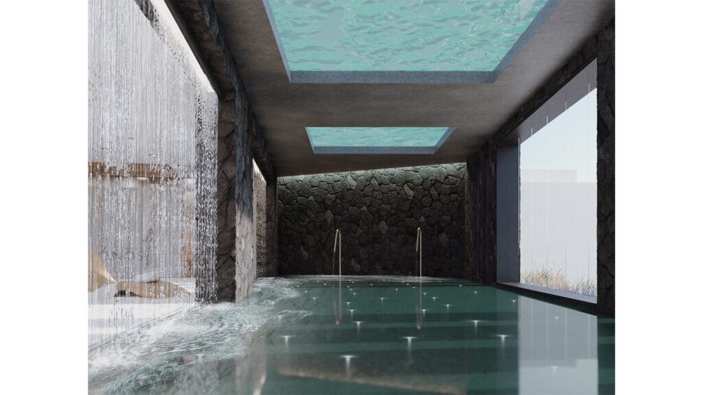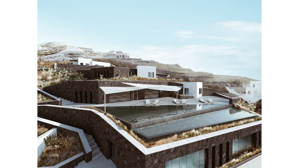 Το προτεινόμενο ξενοδοχειακό συγκρότημα διαμορφώνεται λοιπόν από ένα σύνολο μικρών ορθογωνικών όγκων που ξεπροβάλλουν μέσα από τις γραμμικές ξερολιθιές, που άλλοτε αποτελούν κτιριακό όγκο και άλλοτε απλή διαμόρφωση του περιβάλλοντος χώρου. Η πρόθεση για ένταξη στο φυσικό περιβάλλον οδήγησε στο σχεδιασμό υπόσκαφων κτισμάτων, τη δημιουργία φυτεμένων δωμάτων σε κτίρια που αναπτύσσονται υπό την μορφή γραμμικών ξερολιθιών που τελικά επικαλύπτονται από το φυσικό έδαφος λόγω της έντονης κλίσης του εδάφους, ενώ μεγάλο μέρος των κοινόχρηστων χώρων και βοηθητικών χώρων που απαιτούνται για την σωστή και εύρυθμη λειτουργία μια ξενοδοχειακής μονάδας 5 αστέρων, τοποθετήθηκαν σε υπόγειους χώρους προκειμένου να διατηρηθεί η ισορροπία μεταξύ του δομημένου και του φυσικού τοπίου.