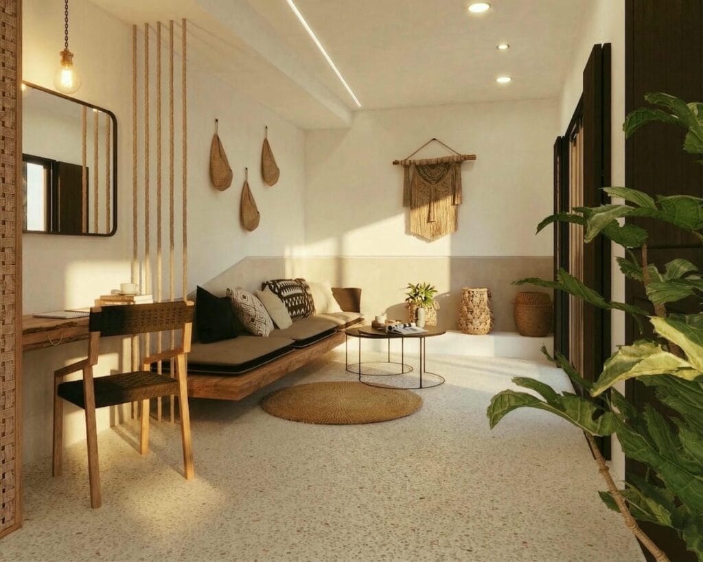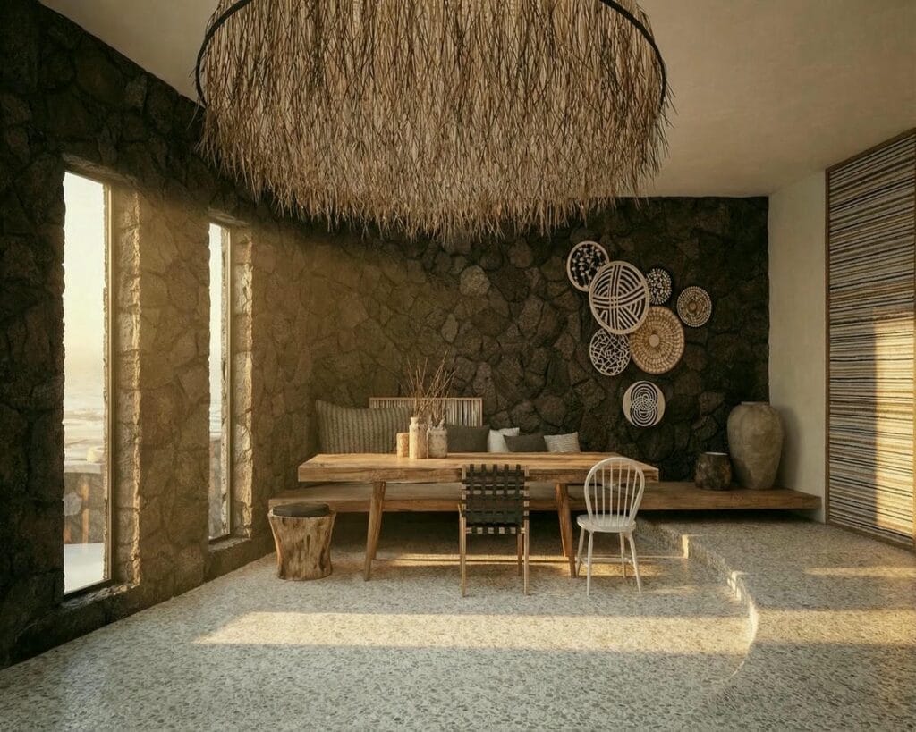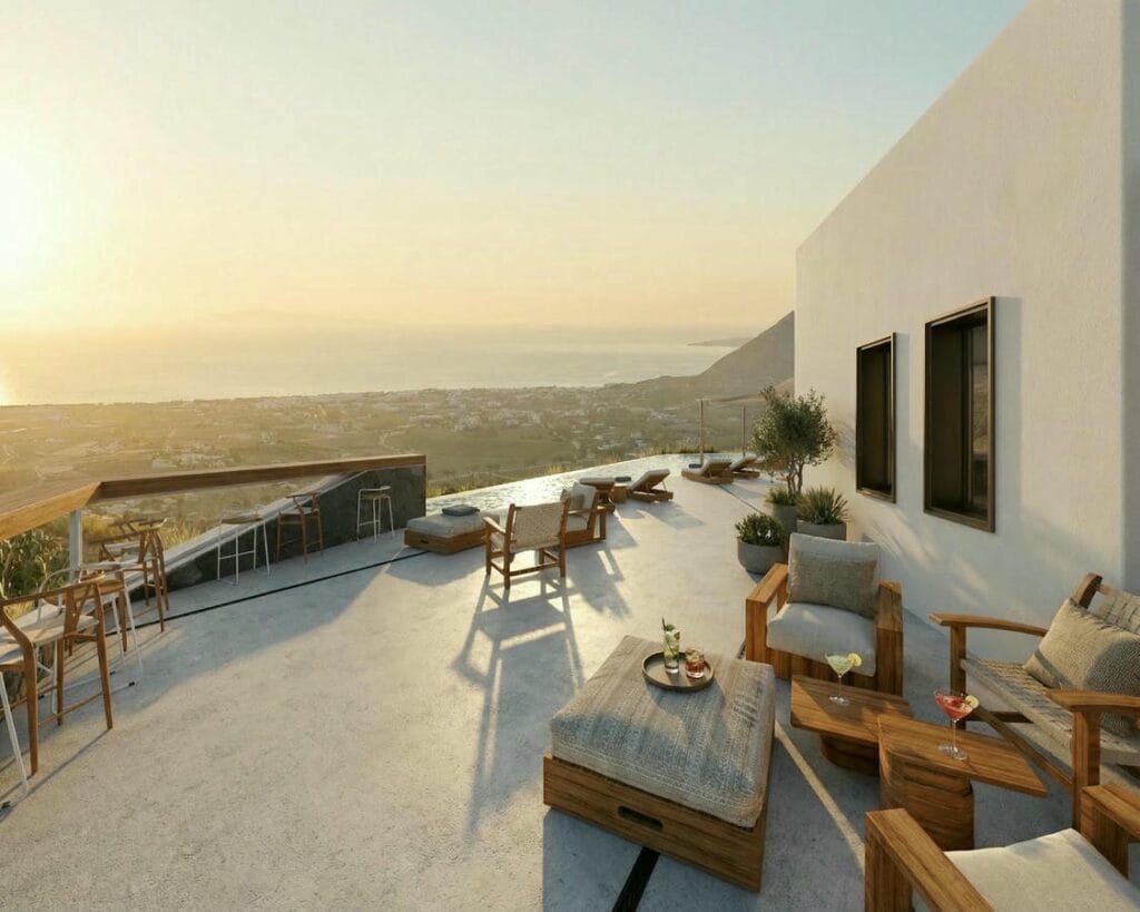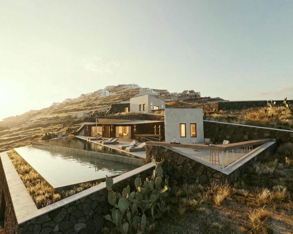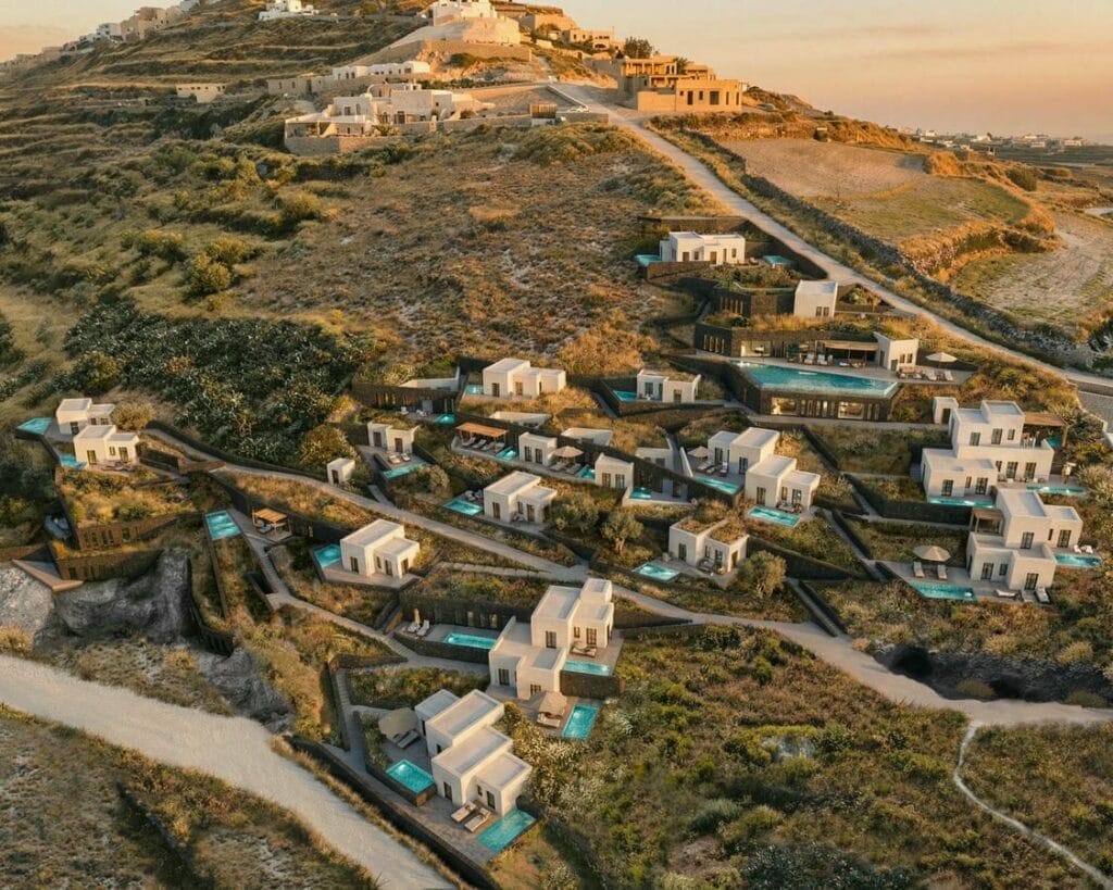 Ακολουθώντας την παραδοσιακή κυκλαδίτικη αρχιτεκτονική επιλέχθηκαν λευκοί όγκοι που πλαισιώνονται από το ξερό φυσικό περιβάλλον της Σαντορίνης, ενώ έντονες γραμμικές πέτρινες διαμορφώσεις διεύρυναν την ποικιλία στις υλικότητες, με τις πεζούλες και την ενσωμάτωση ξύλινων και μαύρων στοιχείων, να συνθέτουν με αισθητική ισορροπία το σύνολο της πρότασης και να δημιουργούν ευχάριστες οπτικές αντιθέσεις.
