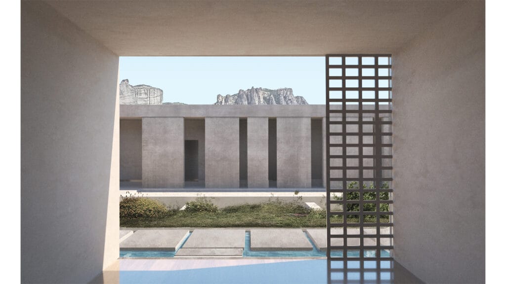 • Διατήρηση της συνεχούς οπτικής επαφής με τα Μετέωρα. Τα δωμάτια του ξενοδοχείου αλλά και ο χώρος του εστιατορίου τοποθετούνται με τέτοιο προσανατολισμό ώστε η όψη τους να ανοίγεται προς τη θέα των Μετεώρων. Ακόμη, ο σχεδιασμός των δωματίων είναι τέτοιος ώστε από κάθε σημείο του εσωτερικού να υπάρχει οπτική επαφή με το έξω με την βασική κίνηση να οδηγεί σε έναν ημιυπαίθριο χώρο που καδράρει τη θέα προς το μνημείο.