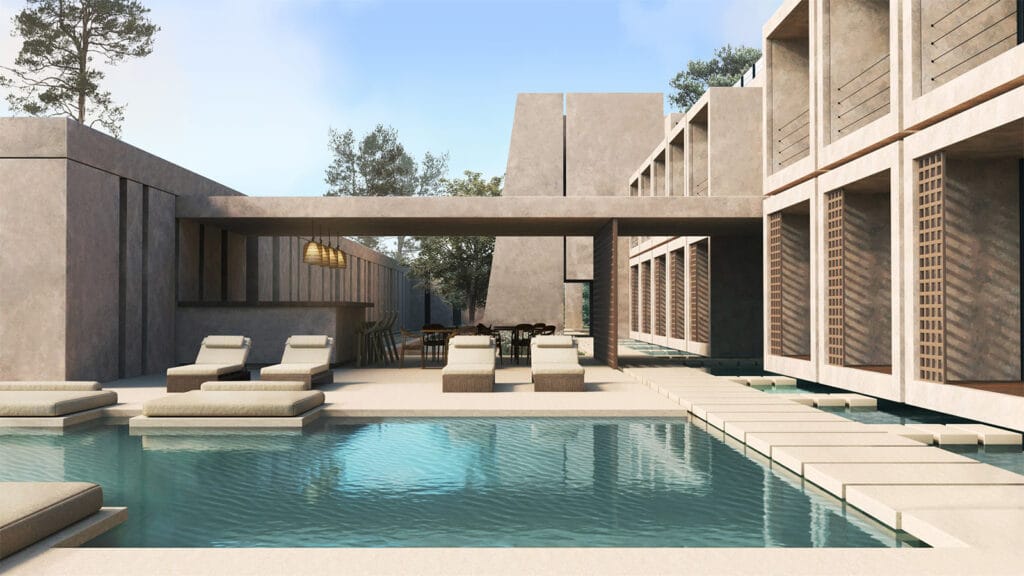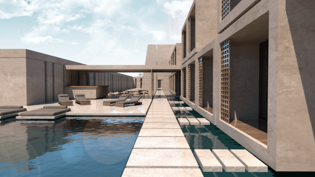• Ένωση με το υδάτινο στοιχείο. Η διαμόρφωση της κεντρική πισίνας ως κεντρικό σημείο στάσης της πορείας του επισκέπτη και η γραμμική πορεία δίπλα σε ένα αβαθές στοιχείο νερού που οδηγεί στο κεντρικό κλιμακοστάσιο και τα δωμάτια, φέρνουν στο προσκήνιο το στοιχείο του νερού, το οποίο αποτελεί κεντρικό στοιχείο του σχεδιασμού του συγκροτήματος.