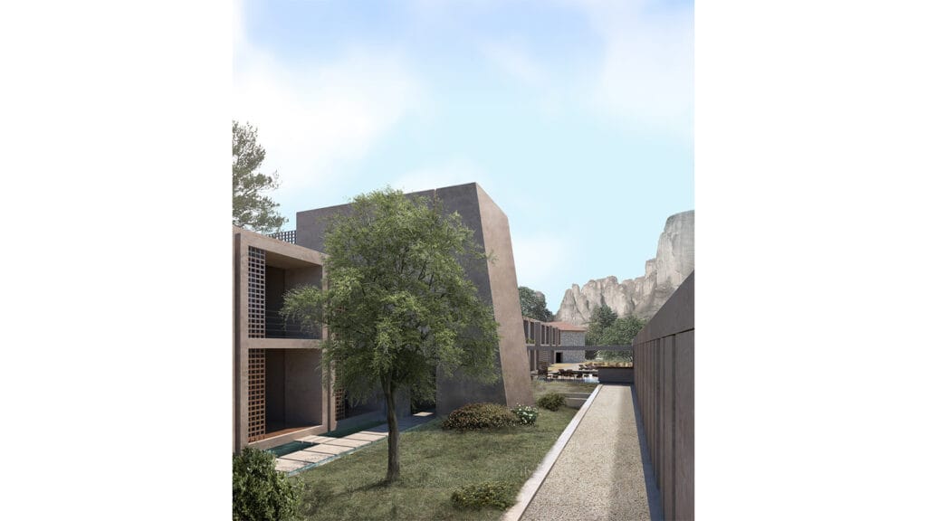 • Γραμμική ανάπτυξη των κτιριακών όγκων. Το νέο κτίριο τοποθετείται γραμμικά μέσω δύο μακροστενων πρισμάτων τα οποία φιλοξενούν τα δωμάτια του ξενοδοχέιο γραμμικά παρατεταγμένα ώστε κάθε ένα να προσανατολίζεται προς τα Μετέωρα. Μία υπαίθρια πορεία θα συνδέει άμεσα τον χώρο της υποδοής που βρίσκεται εντός του υφιστάμενου μύλου με τον υπαίθριο χώρο του καταλύματος προσδίδοντας την αίσθηση της συνέχειας.