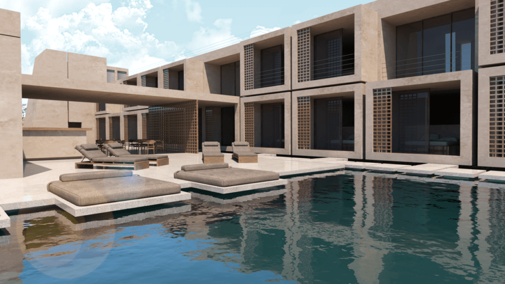 Το προτεινόμενο κατάλυμα αποτελείται από 2 ανεξάρτητους αρχιτεκτονικούς όγκους, έναν υφιστάμενος (μύλος) και έναν νέο ο οποίος τοποθετείται μέσα στον εκμεταλλεύσιμο χώρο του οικοπέδου βάσει σχεδιαστικών αρχιτεκτονικών χαράξεων με σκοπό τη δημιουργία ζωνών χρήσης. Οι αρχιτεκτονικοί όγκοι διαχωρίζονται βάσει των χρήσεων του σε κοινόχρηστους και ιδιωτικούς ενώ η προτεινόμενη διάταξη, αξιοποιεί με το βέλτιστο τρόπο την ιδιωτικότητα των επισκεπτών κατά τη διαμονή τους στο κατάλυμα. Κύριο χαρακτηριστικό της προτεινόμενης αρχιτεκτονικής μελέτης αποτελεί η διάταξη των δωματίων σε σειρά με τους χαρακτηριστικόυς ημιυπαίθριους χώρους της όψης να δημιουργών εσοχές και προεξοχές στο σώμα του κτιρίου.