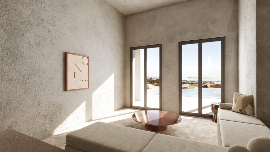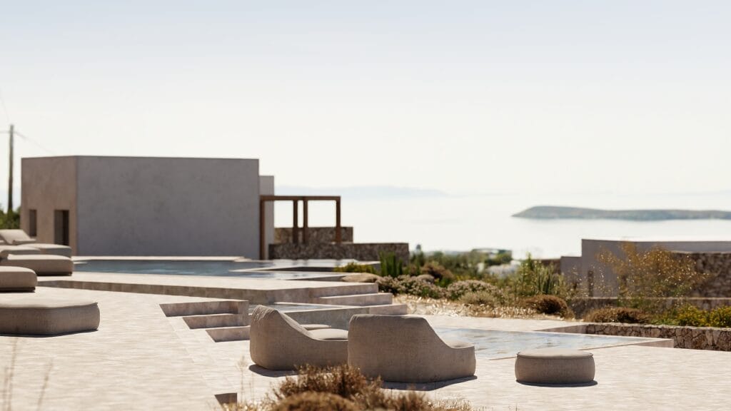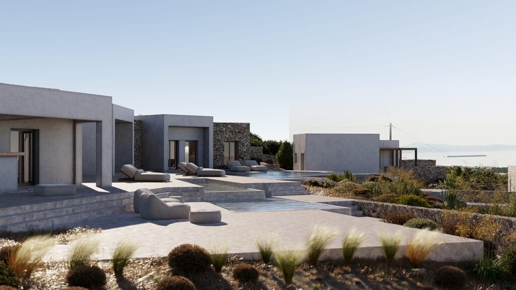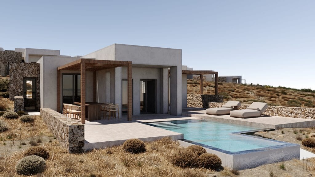 Το υδάτινο στοιχείο αποτελεί κεντρικό συνθετικό άξονα του σχεδιασμού, συνοδεύοντας την εμπειρία του επισκέπτη από την κεντρική πισίνα των κοινόχρηστων χώρων έως τις ιδιωτικές πισίνες των δωματίων, ενισχύοντας τη σχέση αρχιτεκτονικής, τοπίου και φιλοξενίας.